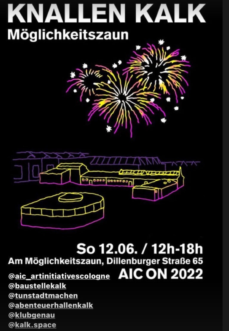 Diese und weitere soziokulturelle Veedels-Angebote sollen im Sommer unter dem Motto „KNALLEN KALK – Ein Feuerwerk der Kunst, Kultur und Stadtentwicklung in und aus Kalk“ auch mit künstlerischen Interventionen und Aktionen bereichert werden. Hierfür laden der kulturhof kalk e.V.,Baustelle Kalk e.V. und genau e.V. ab diesem Sonntag, 12.06., insbesondere Kalker Künstler*innen ein, sich mit der ewigen Zaunfrage zu beschäftigen. Ein „Get Together – Get To Know“, ein Tag für Austausch, ein Tag für Interventionen, für neue Impulse, für Kalk. An diesem öffentlichen Kick Off Termin sind alle eingeladen, sich über den aktuellen Stand der Entwicklungen zu informieren, uns und den Prozess vor Ort kennenzulernen und mehr über die kommenden Projekte und Kooperationen zu erfahren. Es wird Infowände, Arbeitsmöglichkeiten, Drinks und Musik geben.